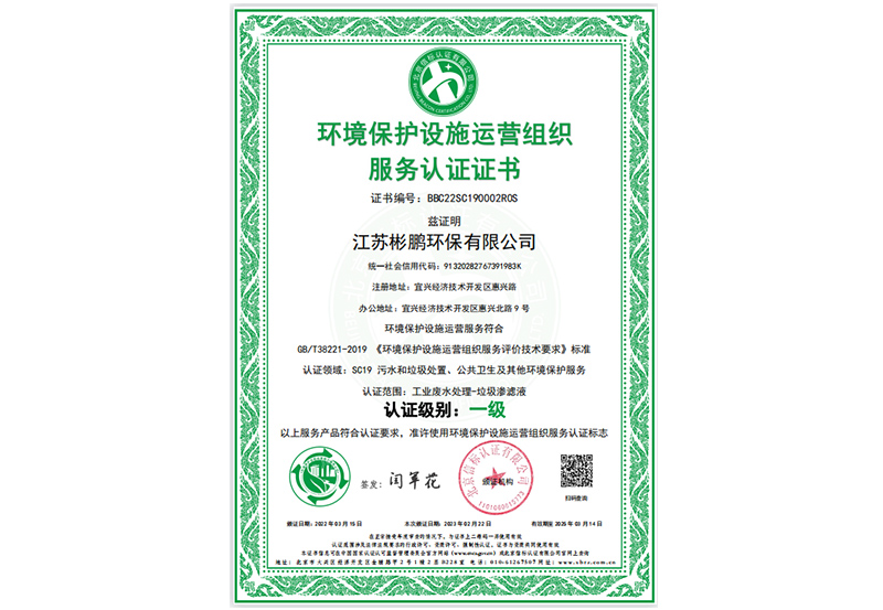 环境保护设施运营组织服务认证证书