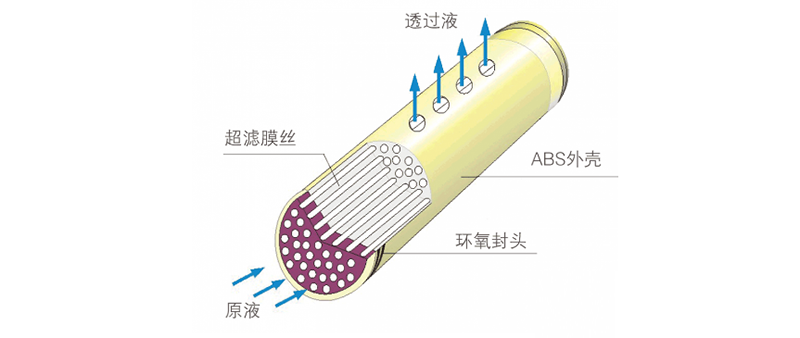超滤(UF)是以压力为推动力,使污水中透过液与部分低分子量溶质穿过膜上微孔到达膜的另一侧,活性污泥及其它乳化胶束团被截留,从而实现泥水分离的目的。